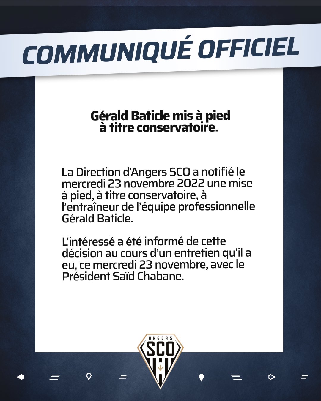 Últimos de la tabla en una temporada con 4 descensos, el Angers tiene muy complicado conseguir la permanencia. El cuadro galo acumula tan solo 8 puntos en 15 jornadas, situación que ha llevado a la directiva a tomar cartas en el asunto. En ese sentido, el contrato de Gérald Baticle, entrenador del club, ha sido finalizado prematuramente.
